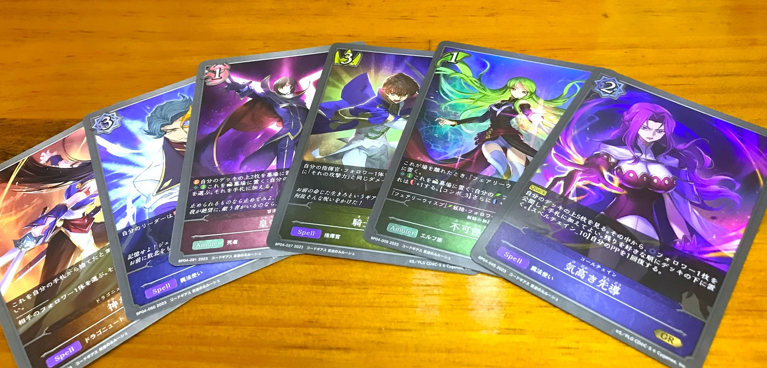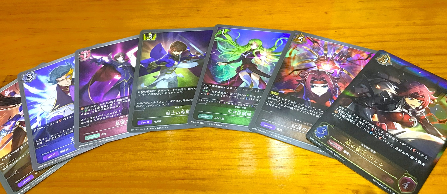 コラボリーダーカードも上記の8名で、主人公のルルーシュのみ2パターン存在するため全9種となってます(リーダーカード9種に加え、フォロワー・スペル・アミュレットなど全21種のコラボカードが収録)。
